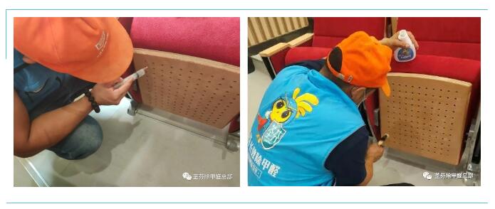 當(dāng)日早上9點(diǎn)許,除甲醛的準(zhǔn)備工作就緒,14名工作人員按照2人一組,分別進(jìn)入宏景小學(xué)教室和教師辦公室,逐層開始每個(gè)教室、辦公室的家具除醛細(xì)節(jié)處理。兩名工作人員分工明確,一人拆下抽屜、放倒椅背、一人手持長(zhǎng)效除醛劑噴瓶,對(duì)著桌椅均勻地噴灑藥劑,緊接著用蘸有除醛藥劑的毛刷刷抽屜、書柜邊角縫,而桌椅孔隙處,一名工作人員正在用針管注射除醛劑。