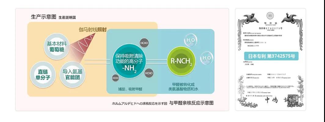 荃芬GRAFTON長效除醛劑:基本原料是葡萄糖等安全物質(zhì),原料經(jīng)過伽馬射線照射,生成穩(wěn)定的氨基高分子聚合物,捕捉、吸附空氣中的甲醛,并與其反應(yīng)生成類氨基酸物質(zhì)與水。整個反應(yīng)過程安全高效,反應(yīng)后無任何有害物質(zhì)生成。荃芬GRAFTON長效除醛劑因采用放射線照射生成的聚合高性能高分子反應(yīng)技術(shù)而取得日本國專利(專利第3742575號)。